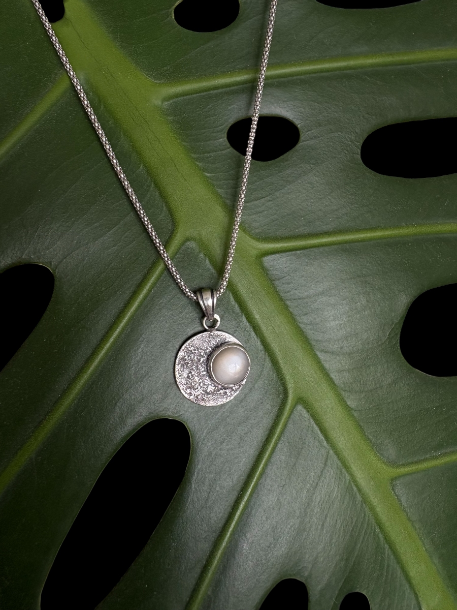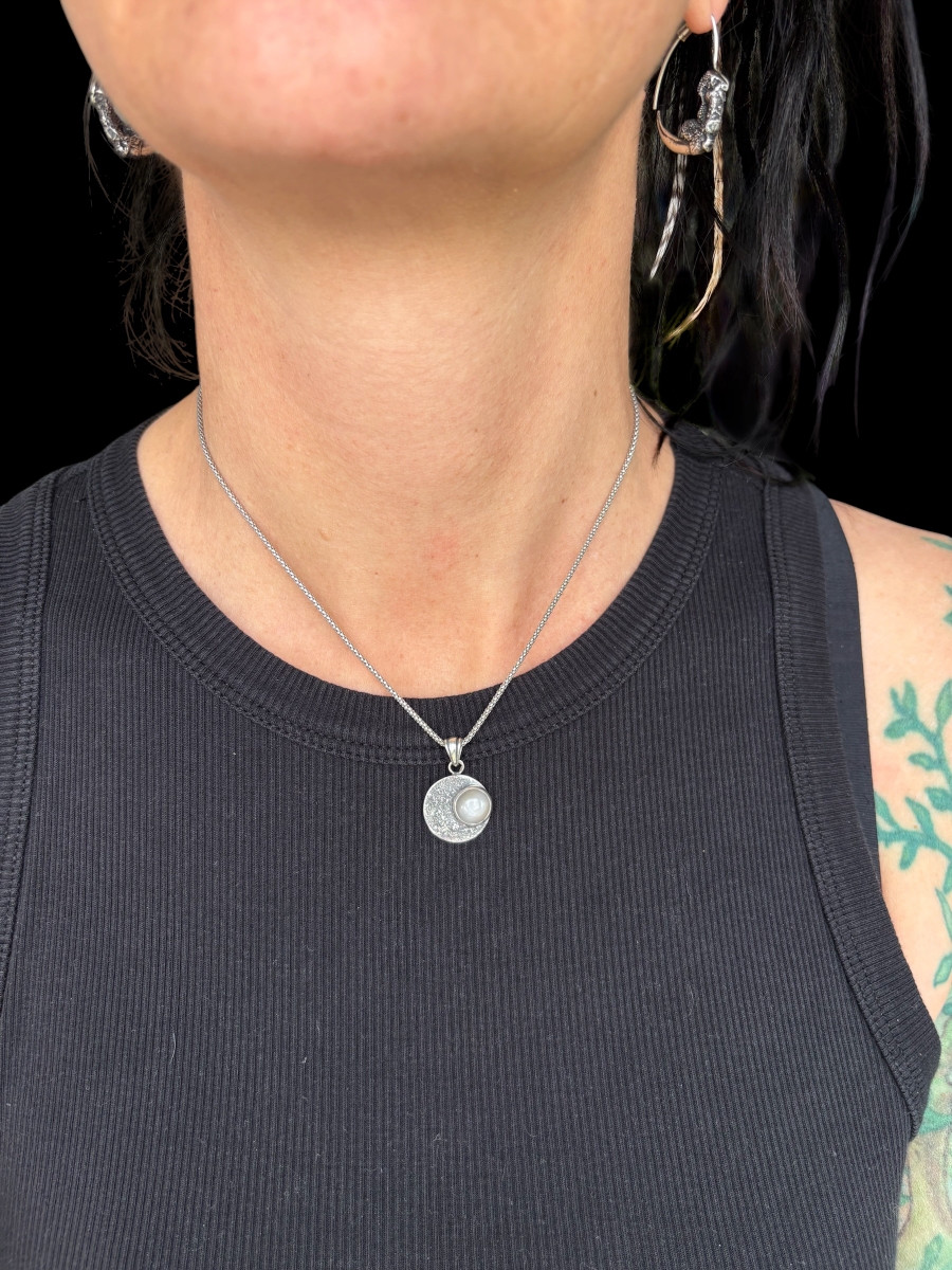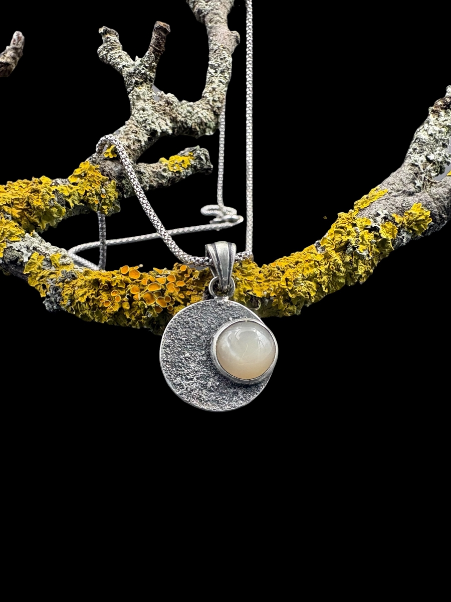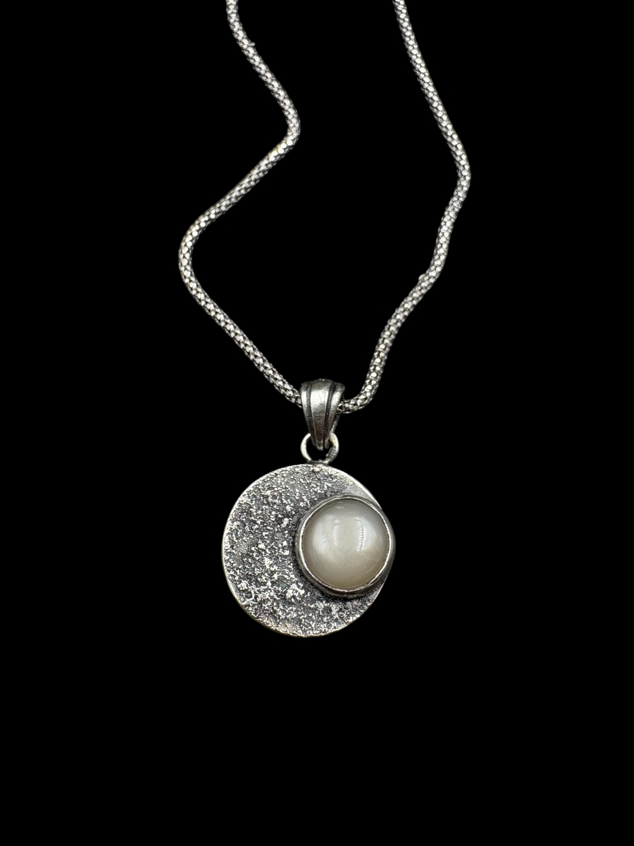 Kör formájú 925 ezüst medál. A felületét ezüstporral kialakított, holdfelszínt idéző textúra határozza meg.